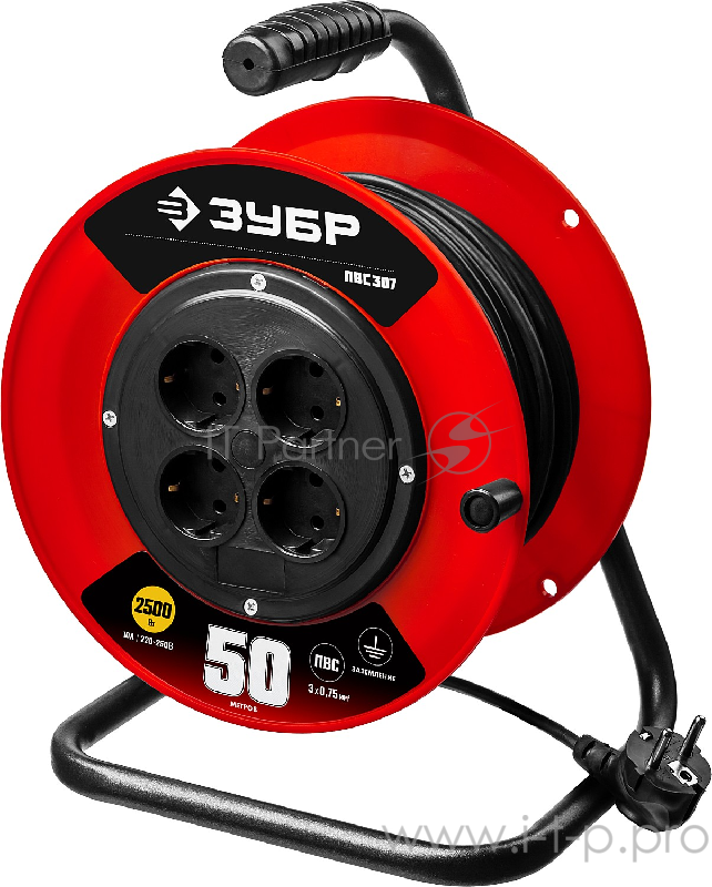 Удлинитель ЗУБР 55083-50 на катушке ПВС 307, 50 м, 2500 Вт, 4 гнезда, ПВС 3х0,75 кв мм