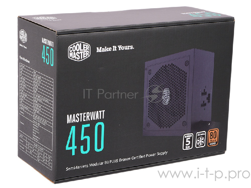 Блок питания Cooler Master MasterWatt 450, ATX, 120mm, 6xSATA, 2xPCI-E(6+2), APFC, 80+ Bronze