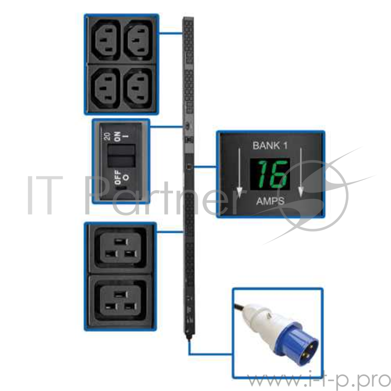 Блок розеток Tripp Lite 7.4kW Single-Phase Metered PDU, 230V Outlets (8 C19 and 40 C13), IEC-309 32A Blue Input, 10 ft. Cord, 0U Vertical, TAA, 70 in.