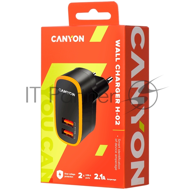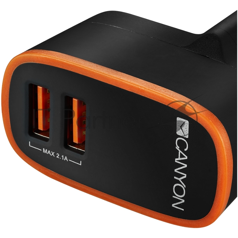 Сетевая зарядка CANYON Universal 2xUSB AC charger (in wall) with over-voltage protection, Input 100V-240V, Output 5V-2.1A , with Smart IC, black rubber coating with orange stripe, 64*56*34.6mm, 0.041kg