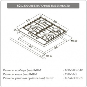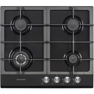 Встраиваемые газовые панели 60 см, газовая, независимая, автоподжиг, жиклёры для баллонного газа, чугунные решетки, черная эмаль/ручки цвета нержавеющая сталь