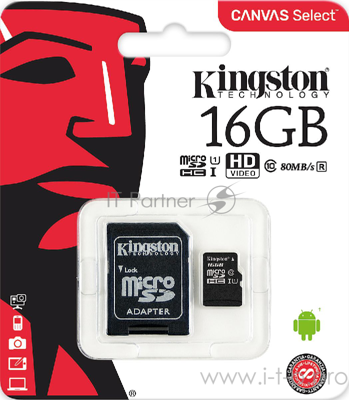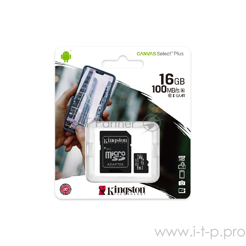 Флеш карта microSDHC 16GB microSDXC Class10 Kingston Class10 UHS-I Canvas Select up to 100MB/s с адапт.