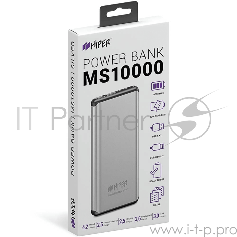 Аккумулятор HIPER Внешний аккумулятор HIPER MS10000 Li-Pol 10000 mAh Aluminum 3A+2.4A 2xUSB 1xType-C серебристый