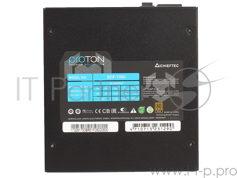 Блок питания Chieftec 750W Retail BDF-750C [Proton] МОДУЛЬНЫЙ, ATX v.2.3/EPS, 80+BRONZE >85%, A.PFC, 4x PCI-E (6+2-Pin), 6x SATA, 3x MOLEX, Fan 14cm