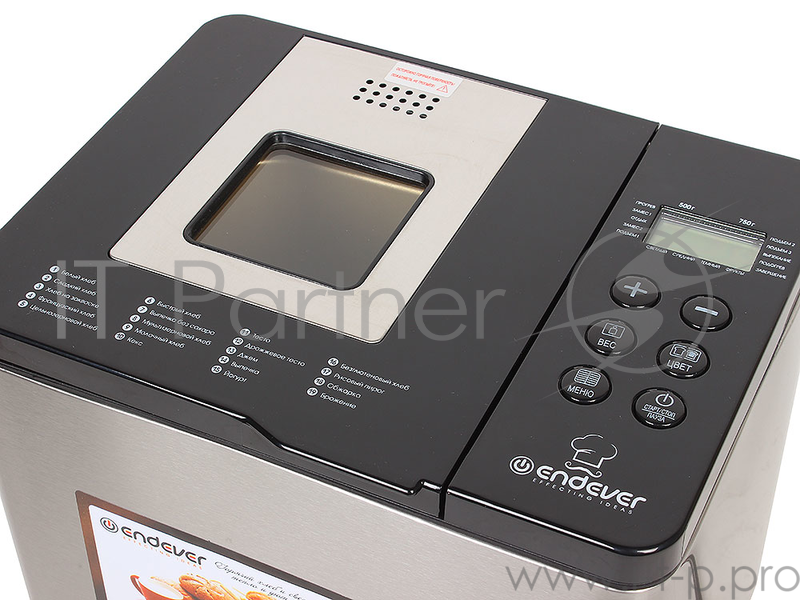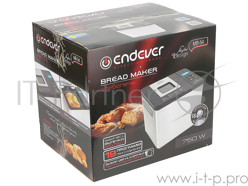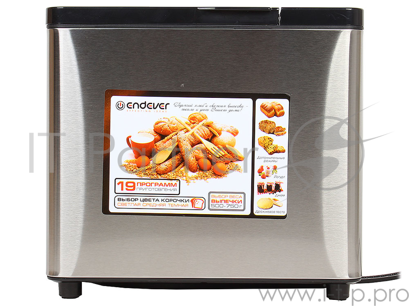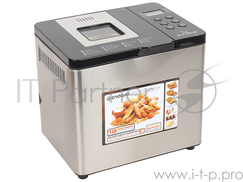 Хлебопечка Endever Skyline MB-54, стальной, мощность 750Вт, LED дисплей,19 автопрограмм, вес выпечки 0,5-0,75 кг, автоподогрев 60 мин, таймер отсрочк