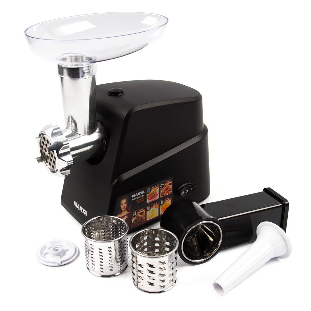 MARTA MT-2020 МясорубкаМаксимальная мощность 2200 Вт, нож нерж.сталь, металлический шнек, функция реверс, 2 диска для фарша (5, 7мм), блок-терка (крупная терка, мелкая терка, шинковка), насадка для колбас, материал лотка-пластик, защита от перегруз