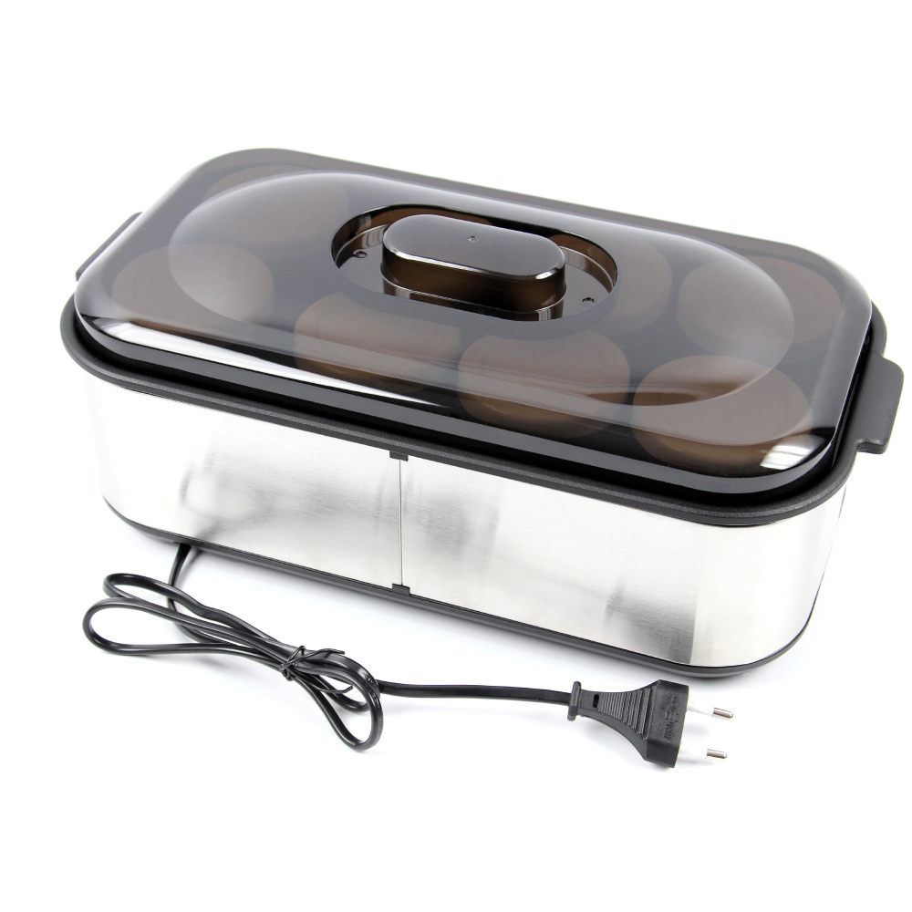 8 баночек для йогурта по 180 мл, общий объем 1,44 лМатериал баночек: стеклоЭлектронный таймер от 8 до 48 часовРегулировка температуры от 20°C до 55°CLED дисплейМатериал корпуса: нержавеющая сталь/пластикЗвуковой сигнал окончания работыАвтоматическое отключениеМощность 30 ВтЭлектропитание: 230 Вольт ~ 50 Герц