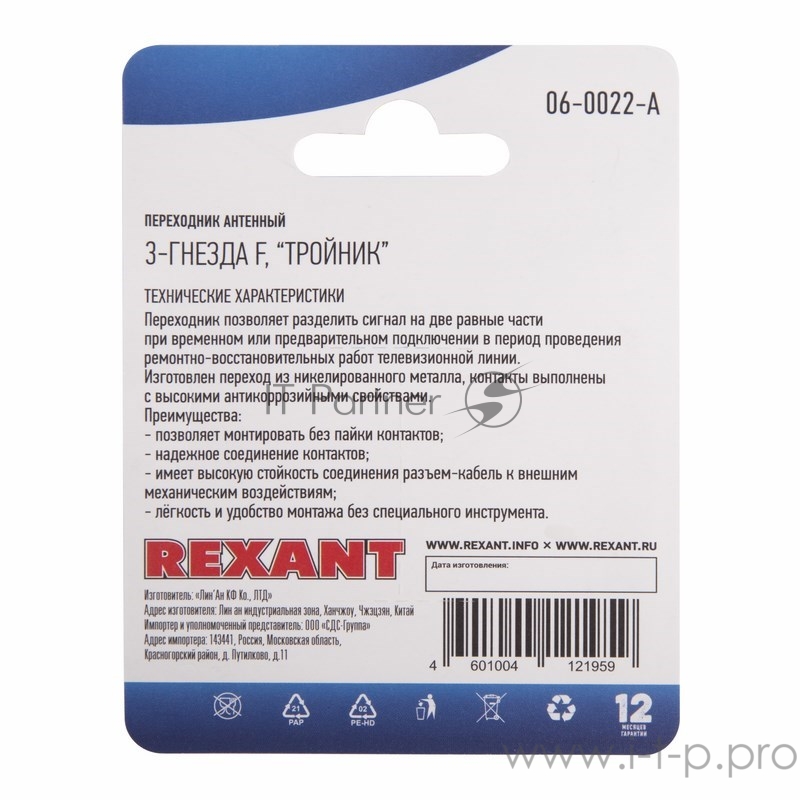 Переходник антенный 3-гнезда F тройник блист. Rexant 06-0022-A
