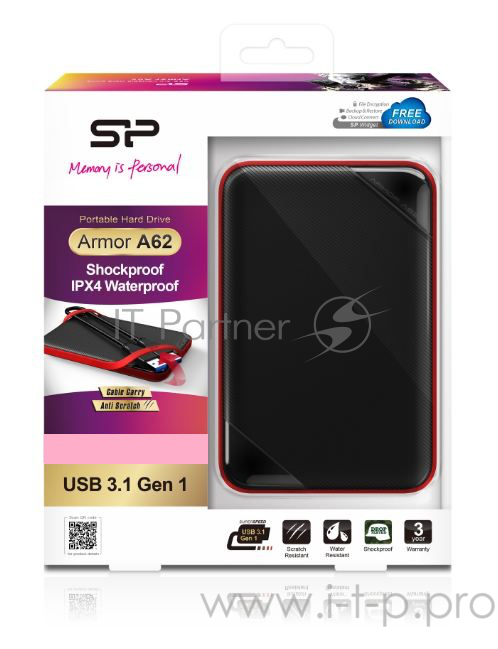External HDD 2.5 2.0Tb Silicon Power Armor A62 черный (USB3.1, прорезиненный, противоударный MIL-STD-810G, водонепроницаемый IPX4, держатель кабеля)