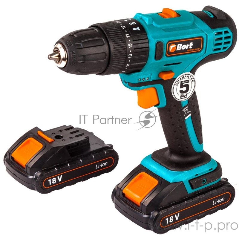 Bort BAB-18Ix2Li-FD Дрель-шуруповерт аккумуляторная ударная [91275998]{ 18 В, 1.5 Ач, Li-lon, 1 Акк, 37 Нм, 400 об/мин, БЗП, 1.1 кг, сумка, ЗУ }