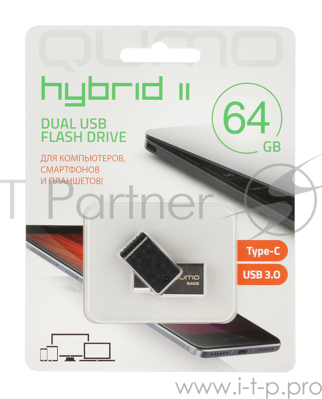 Накопитель QUMO 64GB Hybrid 2 USB 3.0 c двумя коннекторами для подключения к телефону c поддержкой OTG через USB Type-C и РС через USB. (QM64GUD3-Hyb2)