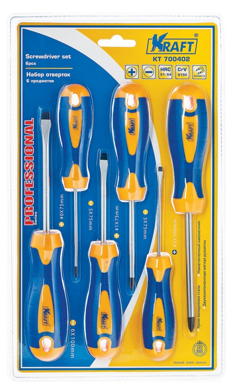Набор отверток KRAFT 6 шт. Cr-V двухкомп. рукоят намагн. након. [KT 700402]