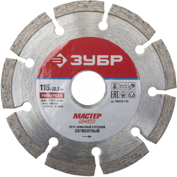 Круг отрезной алмазный ЗУБР МАСТЕР сегментный, сухая резка, 22,2х115мм [36610-115]