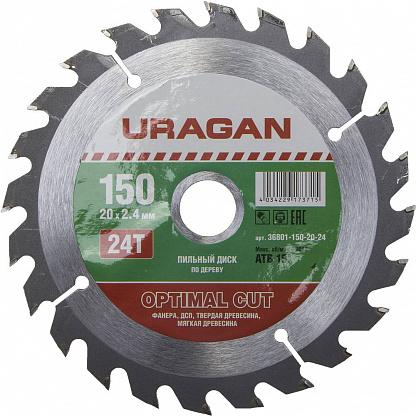Диск пильный URAGAN Optimal cut по дереву, 150х20мм, 24Т [36801-150-20-24]