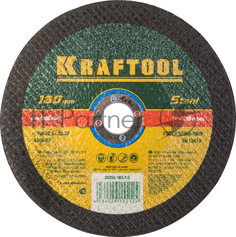 Круг отрезной абразивный KRAFTOOL по металлу, для УШМ, 180x2,5x22,23мм [36250-180-2.5]