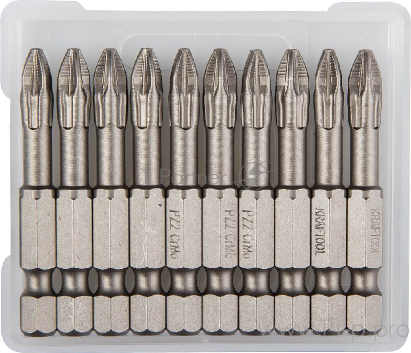 Биты KRAFTOOL EXPERT торсионные кованые, обточенные, Cr-Mo сталь, тип хвостовика E 1/4, PZ2, 50мм, 10шт [26123-2-50-10]