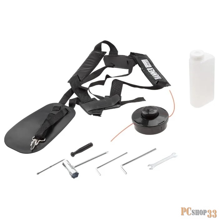 Инструкция,Катушка с леской,Нож для травы,Ремень подвесной,Мерная канистра для смешивания топливной смеси,Ключи для монтажа и обслуживания