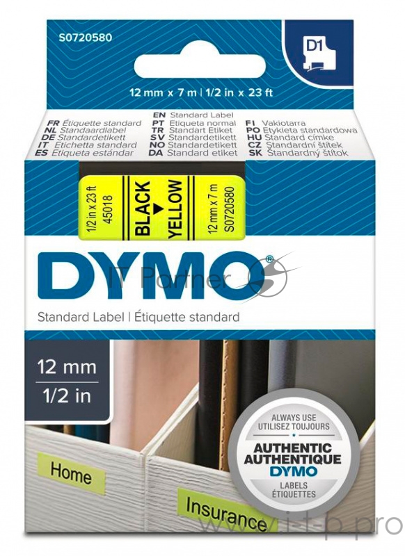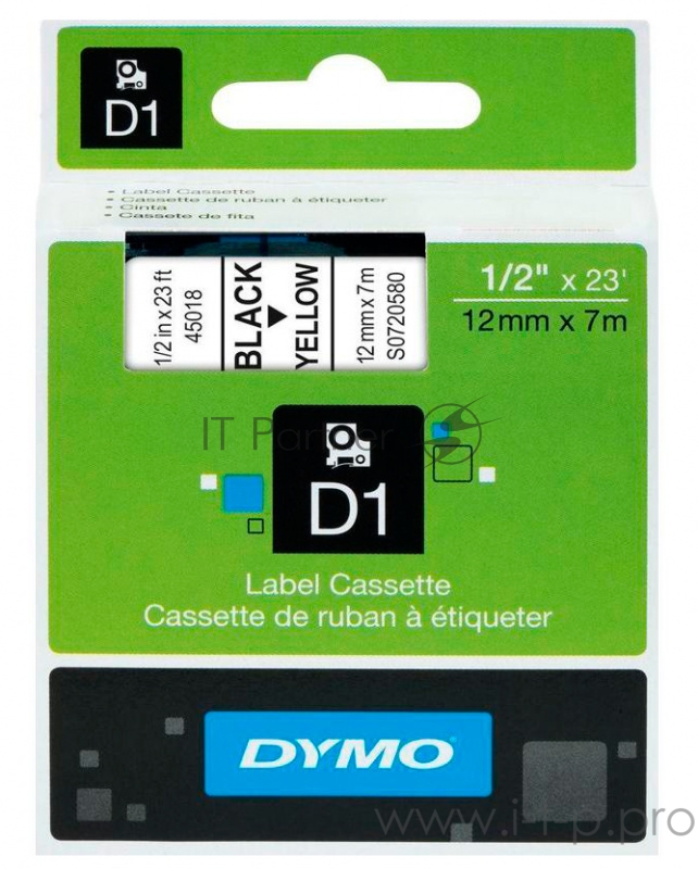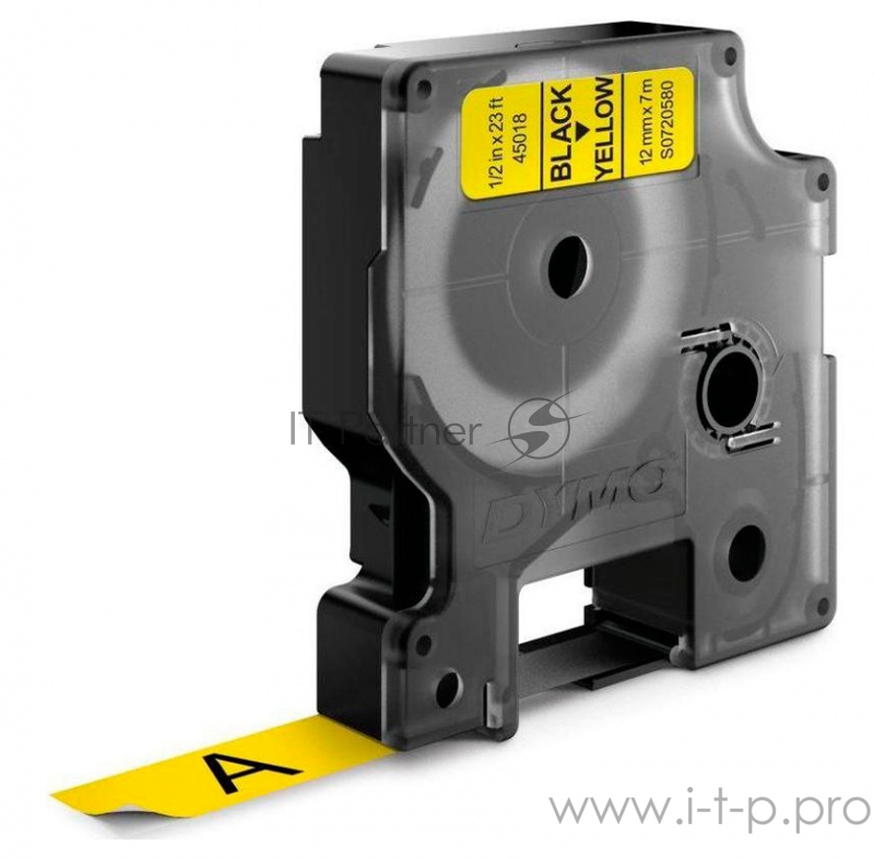 Расходные материалы Картридж с лентой 12 мм х 7 м. , пластик черный шрифт на жёлтом фоне S0720580