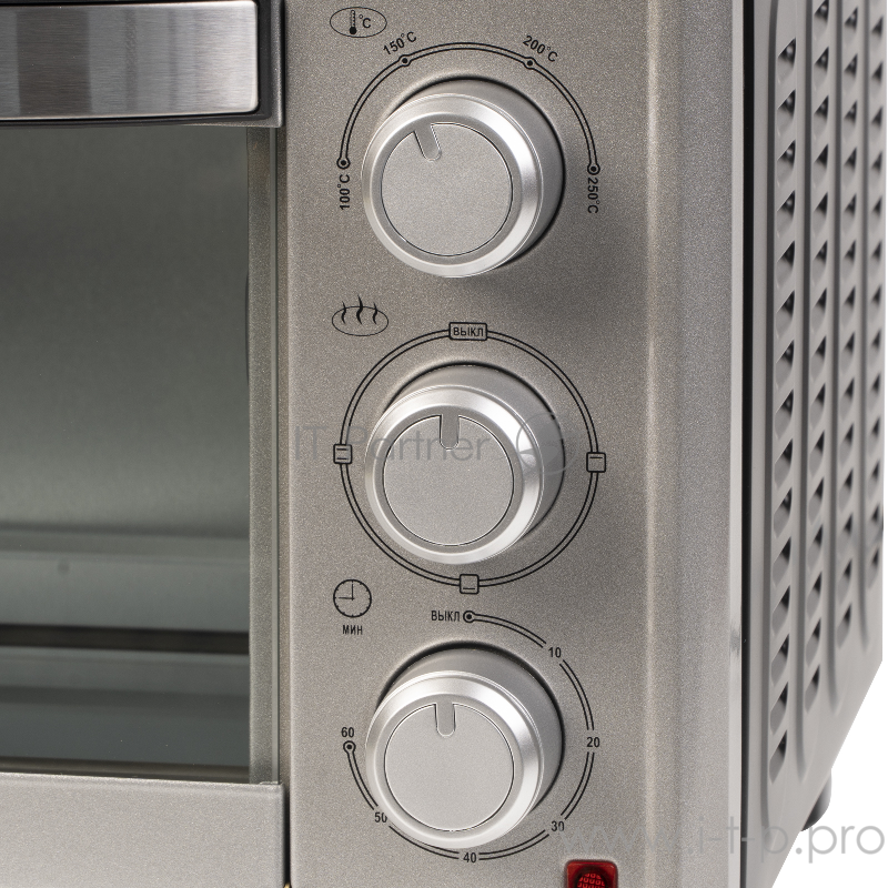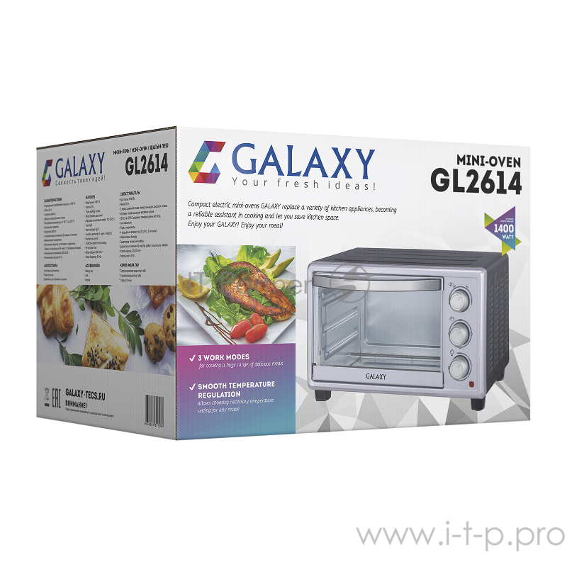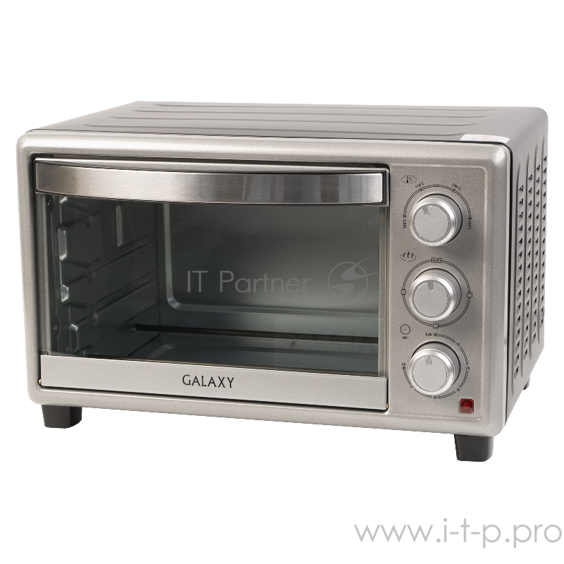 Мини-печь Galaxy GL2614, серебристыймощность1400 Вт ,3 режима работы, дверца из жаропрочного стекла, регулировка температуры от 100 °С до 250 °С, внутренняя подсветка, индикатор работы,4 нагревательных элемента (2 верхних, 2 нижних),механическое упра