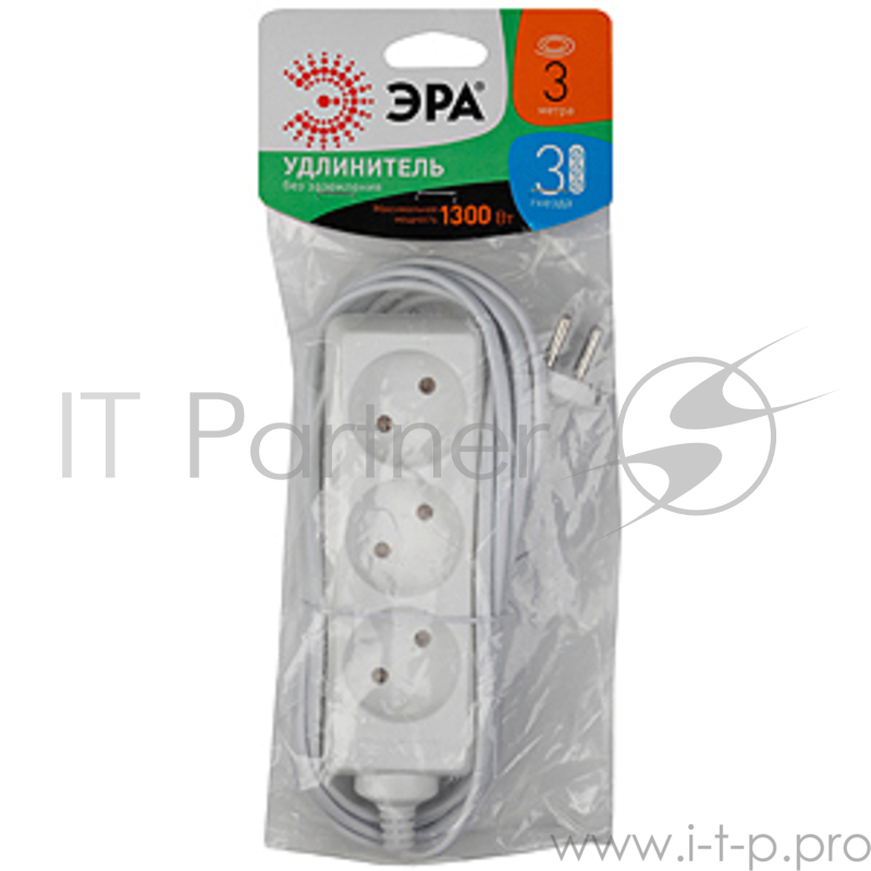 Удлинитель ЭРА без заземл, 1300Вт, 3гн, 3м