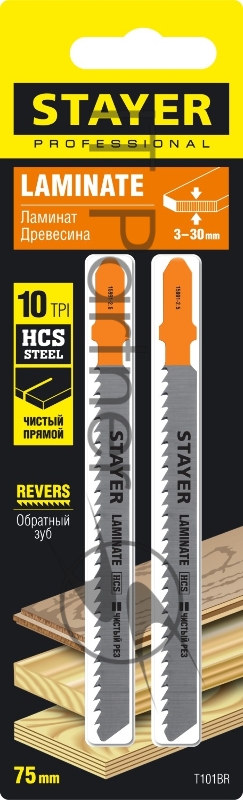Полотна STAYER, T101BR, для эл/лобзика, HCS, по дереву, фанере, ламинату, обратн. рез, T-хвост., шаг 2,5мм, 75мм, 2шт