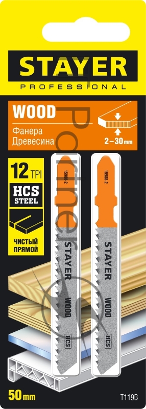 Полотна STAYER, T119B, для эл/лобзика, HCS, по дереву, фанере, ДСП, T-хвост., шаг 2мм, 50мм, 2шт