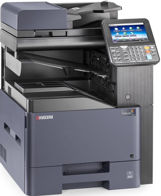 МФУ Kyocera TASKalfa 406ci, цветной лазерный принтер/сканер/копир A4, 40 стр/мин, 1200x1200 dpi, 2048 Мб, 320 Гб HDD, дуплекс, подача: 600 лист., вывод: 500 лист., Post Script, Ethernet, USB, картридер, цветной ЖК-дисплей (max 150000 стр/мес. без кры