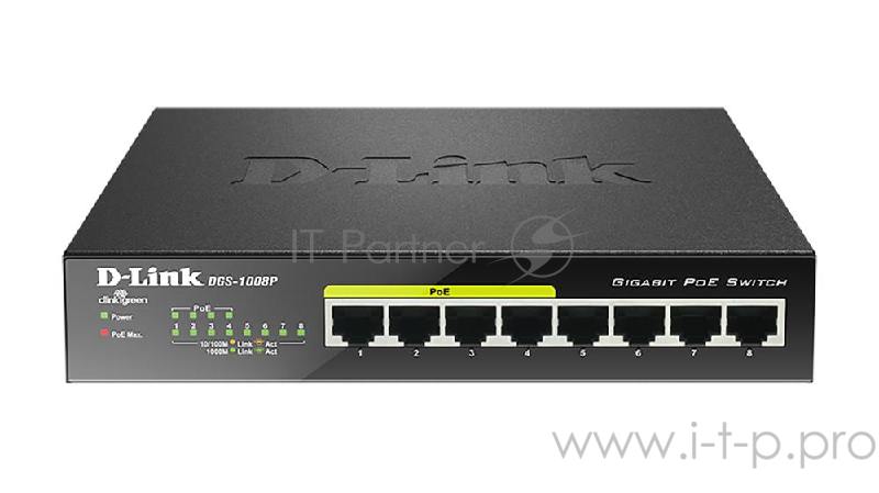 Коммутатор L2 Unmanaged Switch with 8 10/100/1000Base-T ports (4 PoE ports 802.3af/802.3at (30 W), PoE Budget 68). 8K Mac address, Auto-sensing, 802.3x Flow Control, Stand-alone, Auto MDI/MDI-X for each port, D-link Green technology, Metal case.