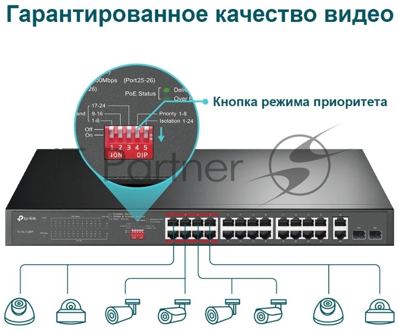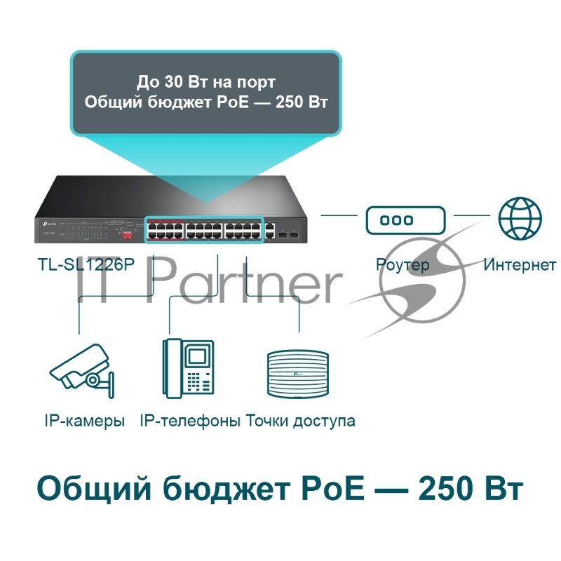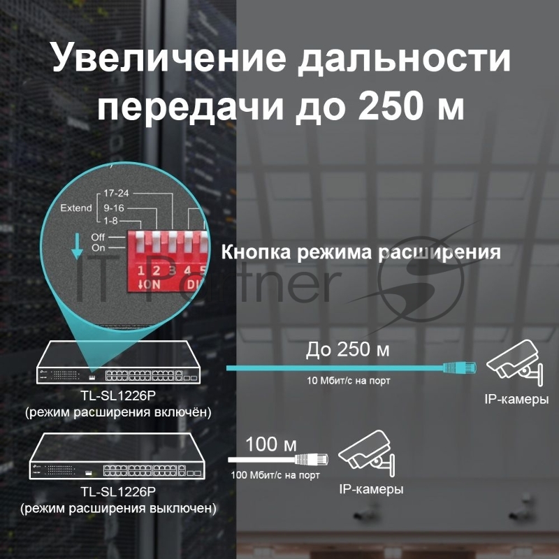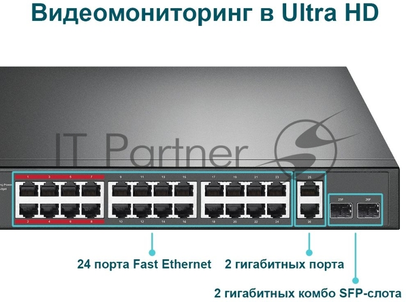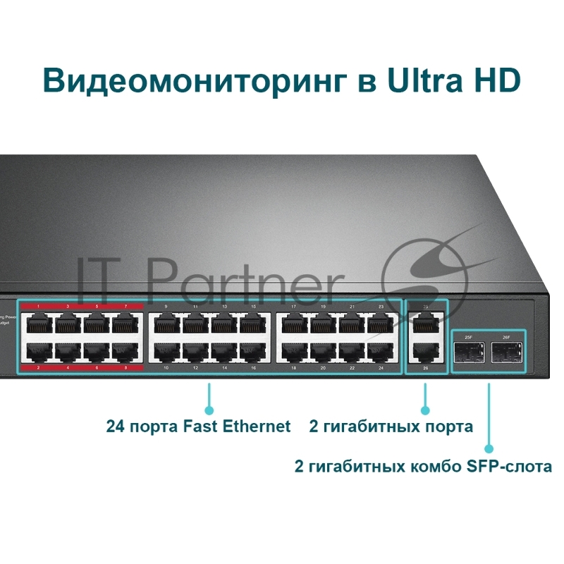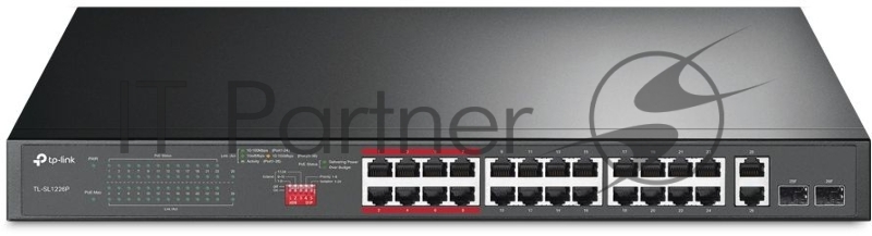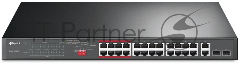 Коммутатор 24-port 10/100Mbps Unmanaged PoE+ Switch with 2 combo RJ-45/SFP uplink ports, metal case, rack mount, 24 802.3af/at compliant PoE+ ports, 2 gigabit combo RJ-45/SFP uplink ports, DIP switches for Extend mode, Isolation mode and Priority mod