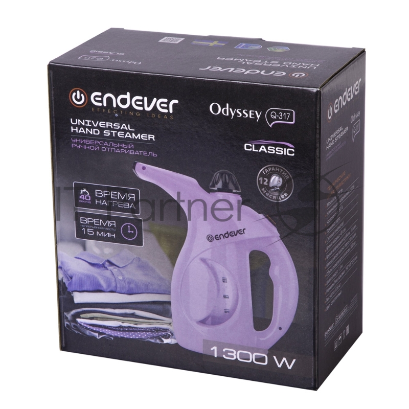 Отпариватель для одежды компактный Endever Odyssey Q-317 фиолетовый, мощность 1300 Вт, производительность пара 30 г/мин, емкость 200 мл, 20 шт/уп