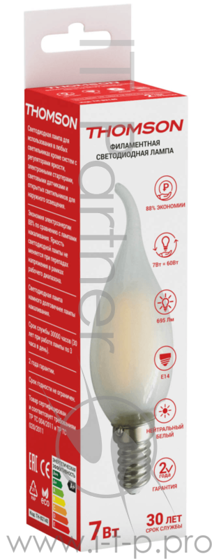 Лампа светодиодная Hiper THOMSON LED FILAMENT TAIL CANDLE 7W 695Lm E14 4500K FROSTED