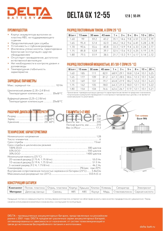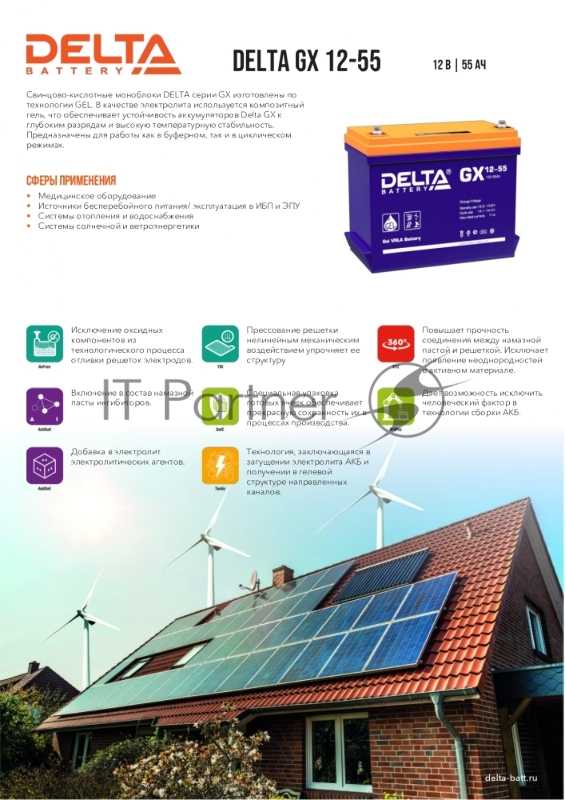 батареи Delta GX 12-55 (55 Ач, 12В) свинцово- кислотный аккумулятор