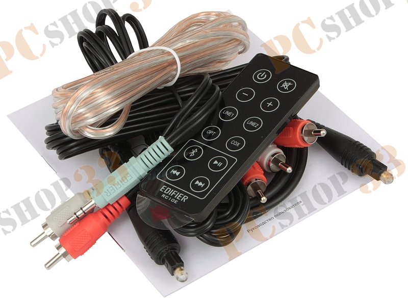 Комплект поставки 2 сателлита, ПДУ, соединительный кабель, кабель RCA, кабель-переходник 2RCA-Jack 3.5 мм, оптический кабель, описание
