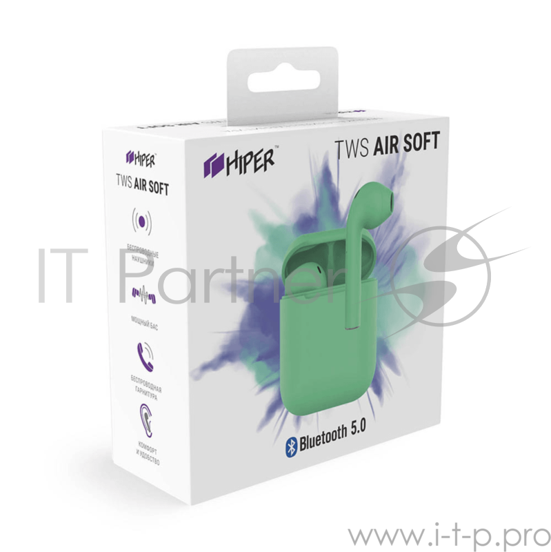 Наушники HIPER Беспроводные наушники HIPER TWS AIR Soft Bluetooth 5.0 гарнитура Li-Pol 2x50mAh+300mAh, Зеленый