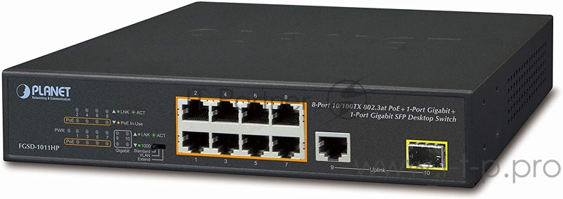 Неуправляемый PoE коммутатор FGSD-1011HP 8-Port 10/100TX 802.3at PoE + 1-Port 10/100/1000T + 1-Port 100/1000X SFP Desktop Switch (120W PoE Budget, Standard/VLAN/Extend mode, 10-inch and rack-mountable)