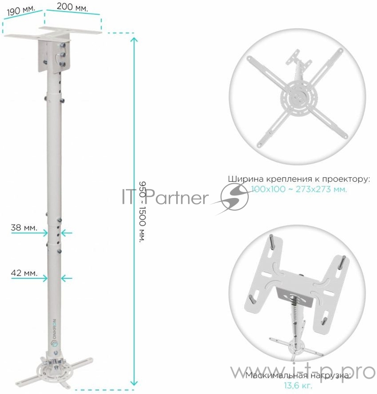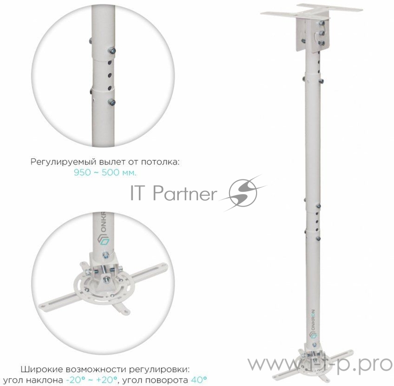 Кронштейн для проектора Onkron K4A белый макс.10кг потолочный поворотно-выдвижной и наклонный