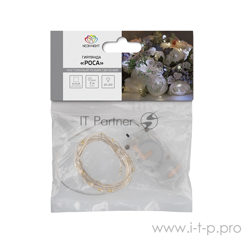 Гирлянда Роса, 2 м, 20 диодов, цвет белый, тонкий батарейный блок