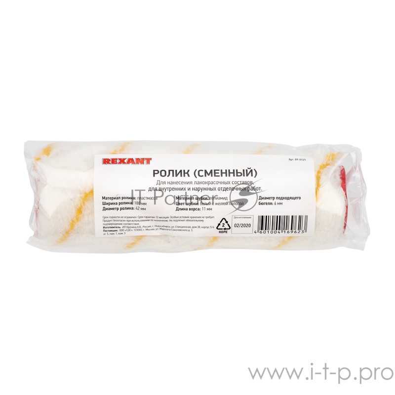 Ролик (сменный) полиамид белый с желтой полосой, ворс 11 мм, ширина ролика 180 мм, Ø 42 мм, бюгель 6 мм REXANT