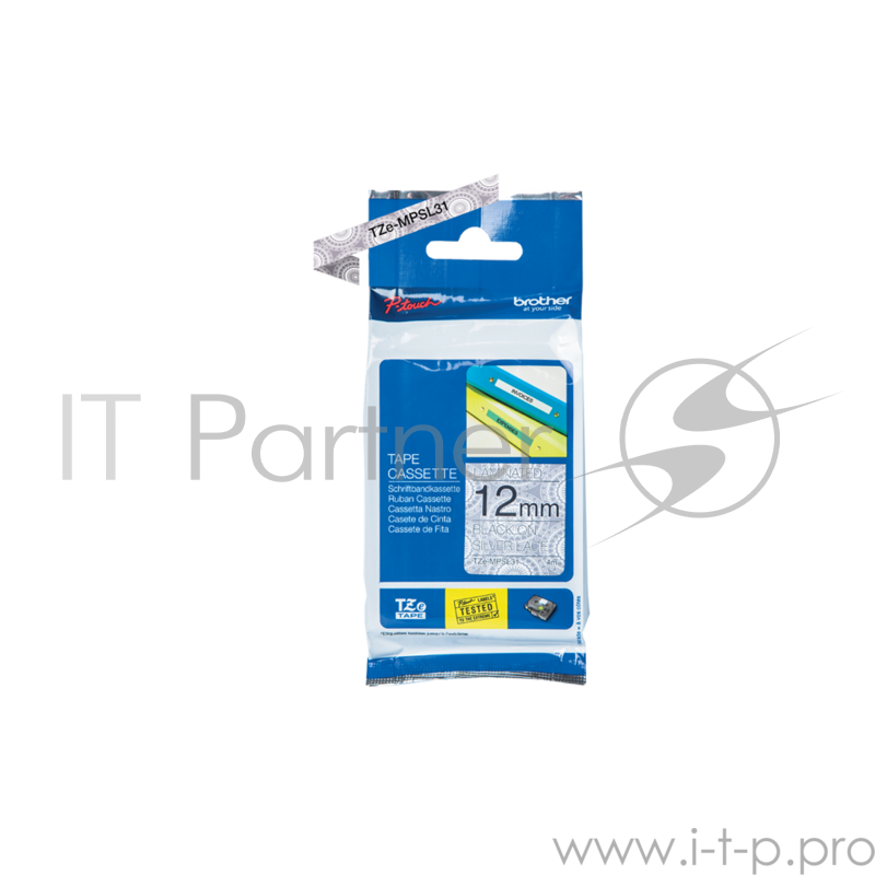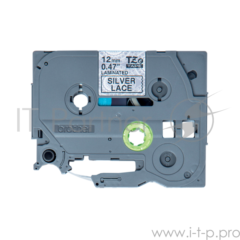 Лента Brother TZe-MPSL31 для печати наклеек черным на фоне серебристого орнамента в виде кружева, ширина 12 мм