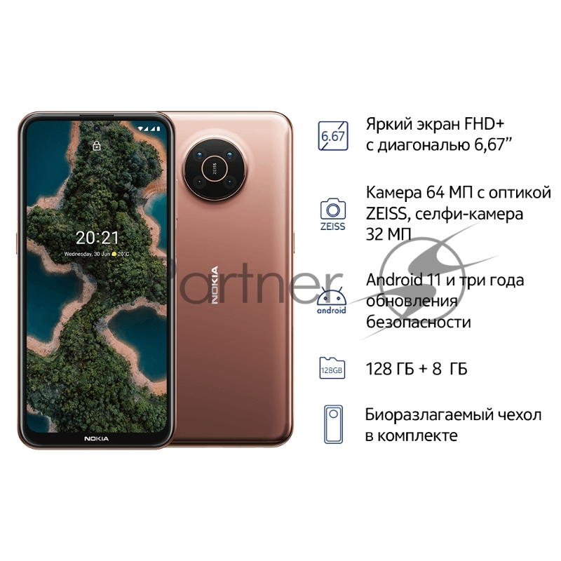 Смартфон Nokia NOKIA X20 DS TA-1341 SAND 8/128, 16,21 см (6.67) 19.5:9 2400 x 1080 пикселей, 4x2,0 ГГц+4x2,0 ГГц, 8 Core, 8GB RAM, 128GB, up to 512GB flash, 64 МП+5 МП+2 МП+2 МП/32 MP, Nano Sim+Nano Sim/Гибридный слот MicroSD (2-в-3), 2G, 3G, LTE, BT