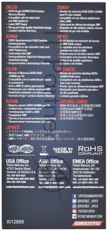 Память DDR4 16Gb 4000MHz Patriot PVE2416G400C0 RTL Gaming PC4-32000 CL20 DIMM 288-pin 1.4В