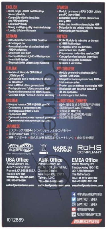 [Модуль памяти] Память DDR4 8Gb 4000MHz Patriot PVE248G400C0 RTL Gaming PC4-32000 CL20 DIMM 288-pin 1.4В