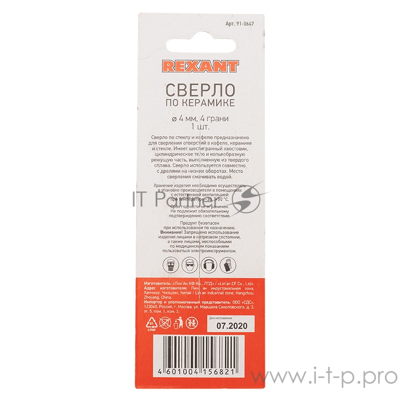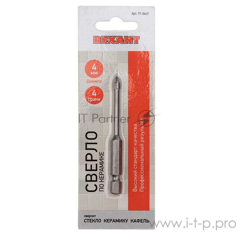 Сверло по стеклу и керамике 4 мм 4 грани шестигр. хвост. REXANT