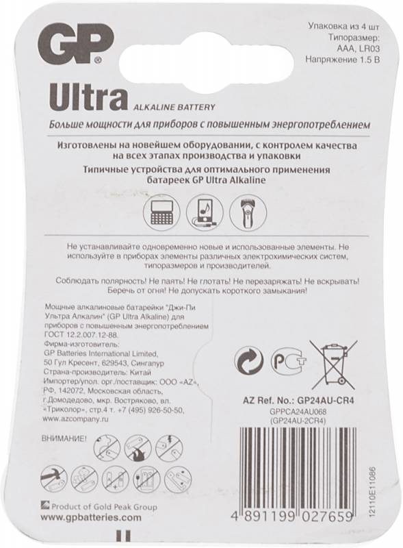 Батарея GP Ultra Alkaline 24AU LR03 AAA (4шт)