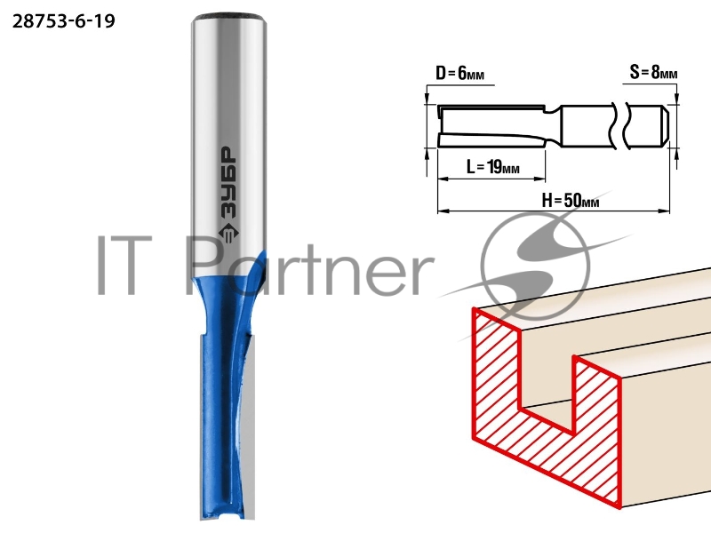 Фреза ЗУБР 28753-6-19 пазовая прямая d= 6мм рабочая длина-19мм хв.-8мм профессионал