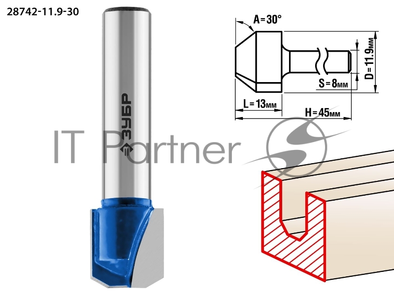 Фреза ЗУБР 28742-11.9-30 пазовая фасонная №3 d= 11.9мм дл.-13мм угол-30 градусов хв.-8мм