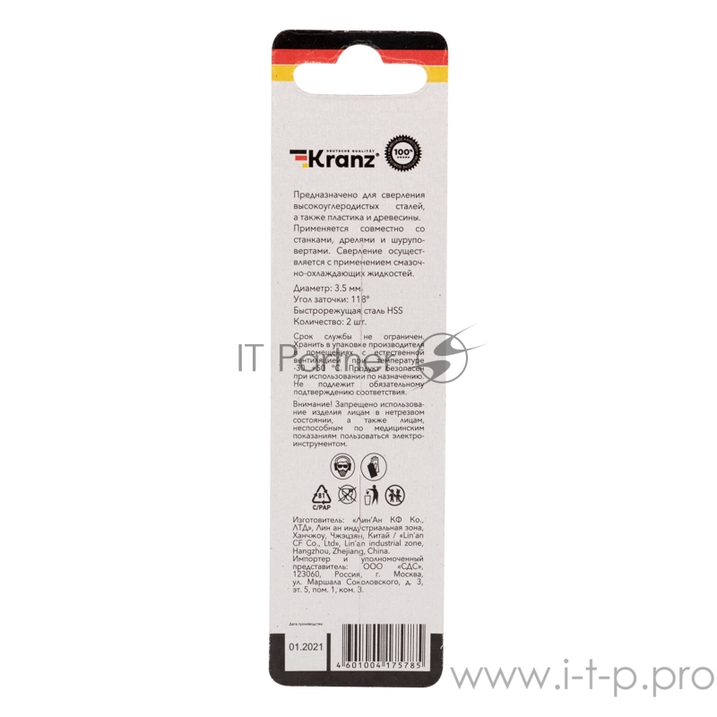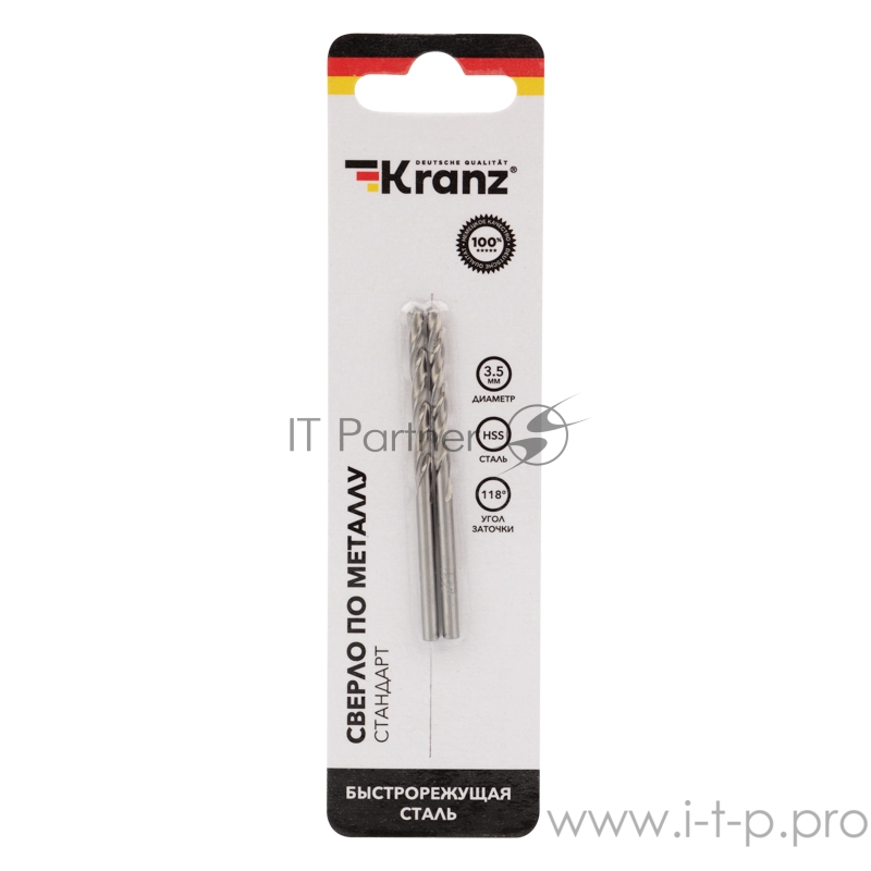 Сверло по металлу 3,5 мм HSS (2 шт. в упаковке) DIN 338 Kranz