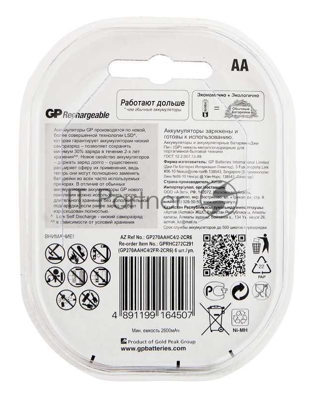Аккумулятор GP Rechargeable 2700AAHC4/2 AA NiMH 2700mAh (6шт) блистер