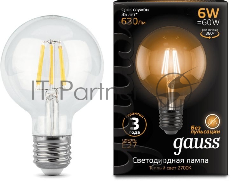 GAUSS 105802106 Светодиодная лампа LED Filament G95 E27 6W 630lm 2700K 1/20