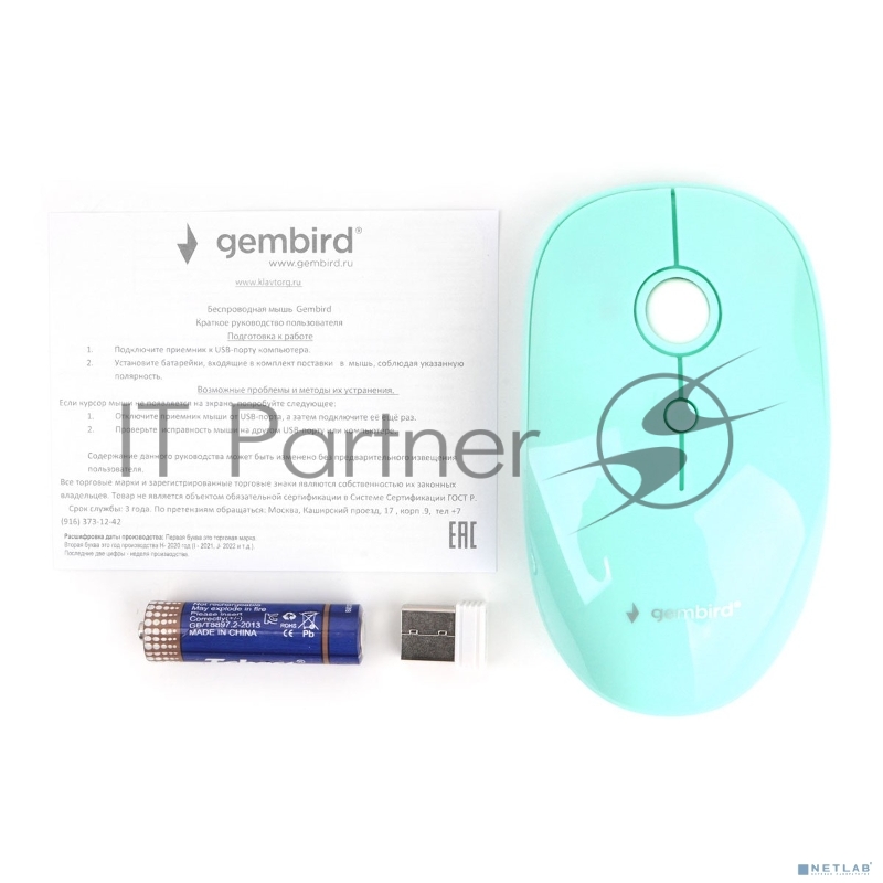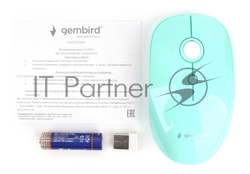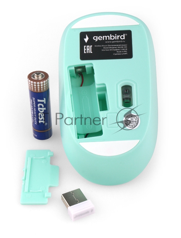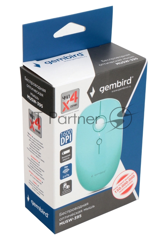 Мышь беспроводная Gembird MUSW-395, 2.4ГГц, 2 кнопки + колесо кнопка,1000DPI мятный глянец